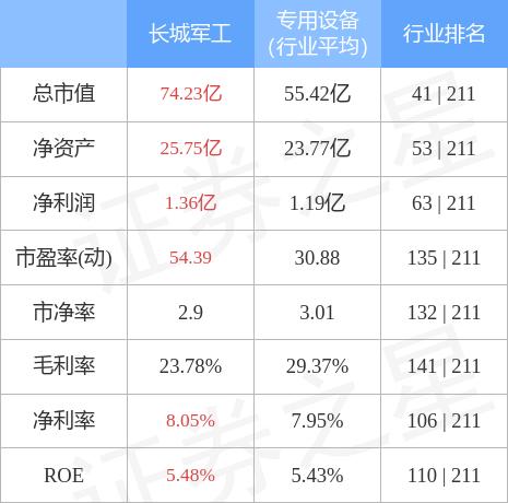 长城军工主要指标及行业内排名如下: