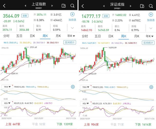 至11月26日收盘,上证综指跌0.56%,报3564.09点;科创50指数跌0.55%,报1459.93点;深证成指跌0.34%,报14777.17点;创业板指跌0.16%,报3468.87点。