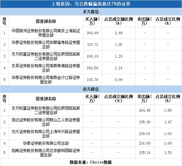 买三、卖一均为东方财富证券拉萨团结路第二证券营业部,该营业部买入190.10万元,卖出264.48万元,净买额为-74.38万元。近三个月内该席位共上榜1371次,实力排名第4。东方财富证券拉萨团结路第二证券营业部今日还参与了英特集团(净买额755.06万元),拱东医疗(净买额745.18万元),康泰医学(净买额-587.47万元)等16只个股。