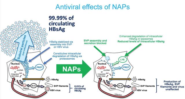 目前,这两款在研且靶点相同的 NAP已经同时开发用于针对HBV和HBV/HDV感染潜在联合疗法。小规模适应症概念验证临床试验表明,NAP给药方案耐受性良好,可有效清除血清HBsAg。