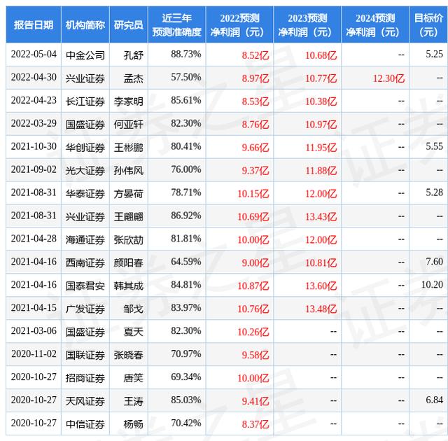 证券之星数据中心根据近三年发布的研报数据计算,中金公司孔舒研究员团队对该股研究较为深入,近三年预测准确度均值高达88.73%,其预测2022年度归属净利润为盈利8.52亿,根据现价换算的预测PE为10。