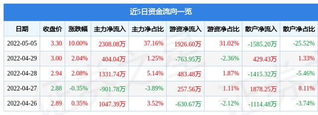 资金流向数据方面,5月5日主力资金净流入2308.08万元,游资资金净流入1926.6万元,散户资金净流出1585.2万元。