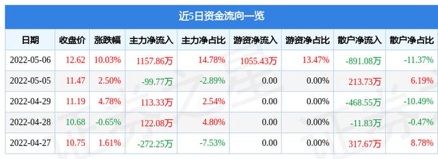 资金流向数据方面,5月6日主力资金净流入1157.86万元,游资资金净流入1055.43万元,散户资金净流出891.08万元。