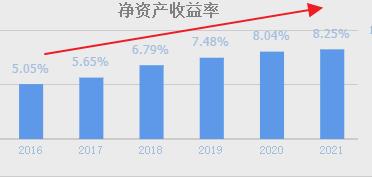 公司的净资产收益率从2016年的5个点,一路上升到了2021年的8.25个点。