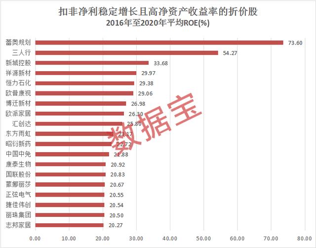 价折质不折是这62股的主要特征。数据宝统计显示,上述62股中过去5年(2016年至2020年)的净资产收益率(ROE)均为正,平均值超过10%的个股占比七成以上。33股过去5年(2016年至2020年)的净资产收益率连续超过10%,19股平均超过20%,蕾奥规划、三人行、新城控股平均净资产收益率超过30%;恒力石化、欧派家居、东方雨虹等16股平均净资产收益率超过20%。