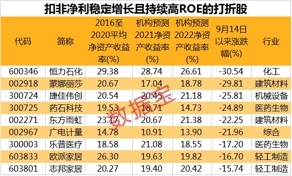 股神巴菲特选股除了看业绩外,最看重的就是上市公司的投资回报(净资产收益率)。数据宝统计,在过去5年净资产收益率均超过10%的33股中,机构一致预测2021年、2022年净资产收益率继续维持在10%以上,且9月14日以来股价折扣超15%的个股仅有11只。恒力石化今、明两年净资产收益率均有望超过25%,恒力石化是国内最大、综合实力最强的PTA-聚酯新材料产业链一体化企业,公司涉及可降解塑料等热门题材,机构一致预测其今年净利润有望增长25%以上。乐普医疗、药石科技两只医药股今年的业绩均有望大幅增长。另外,机构预测捷佳伟创、广电计量等4股2022年的净利润有望增长30%以上。
