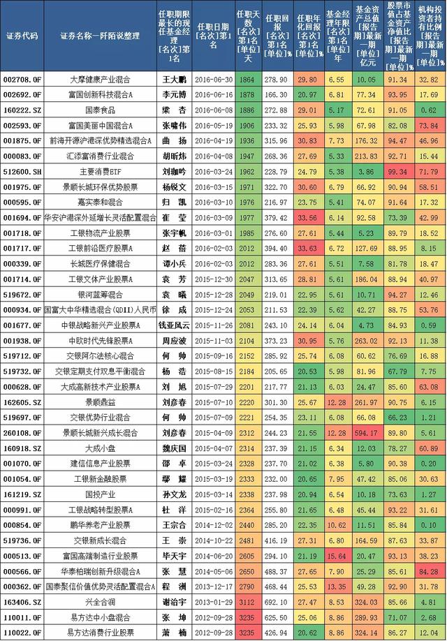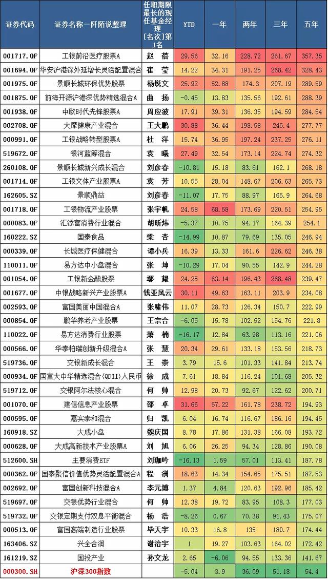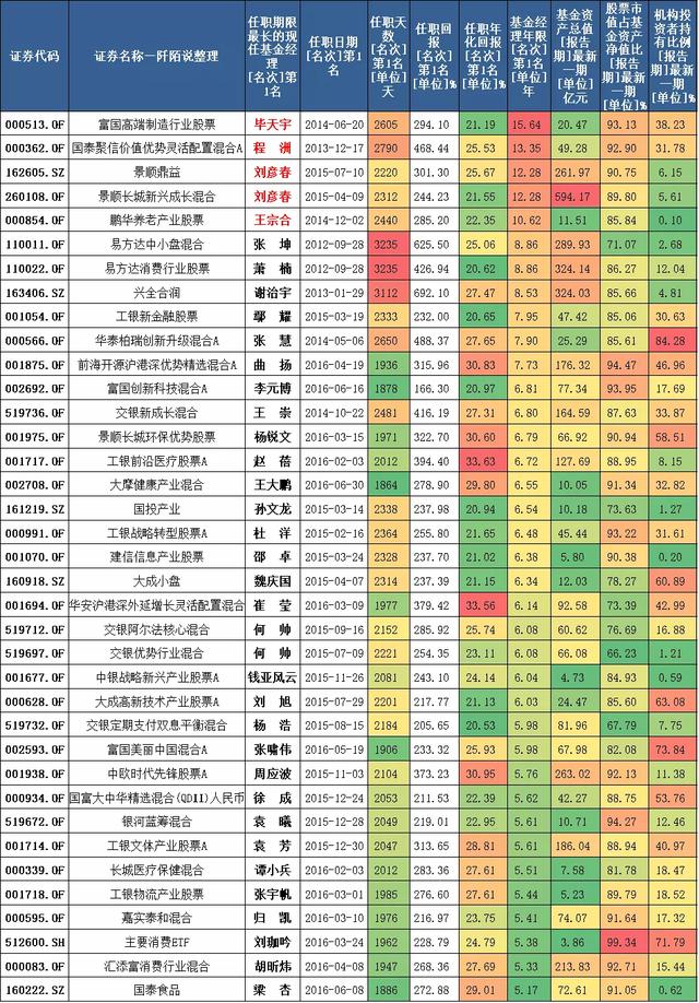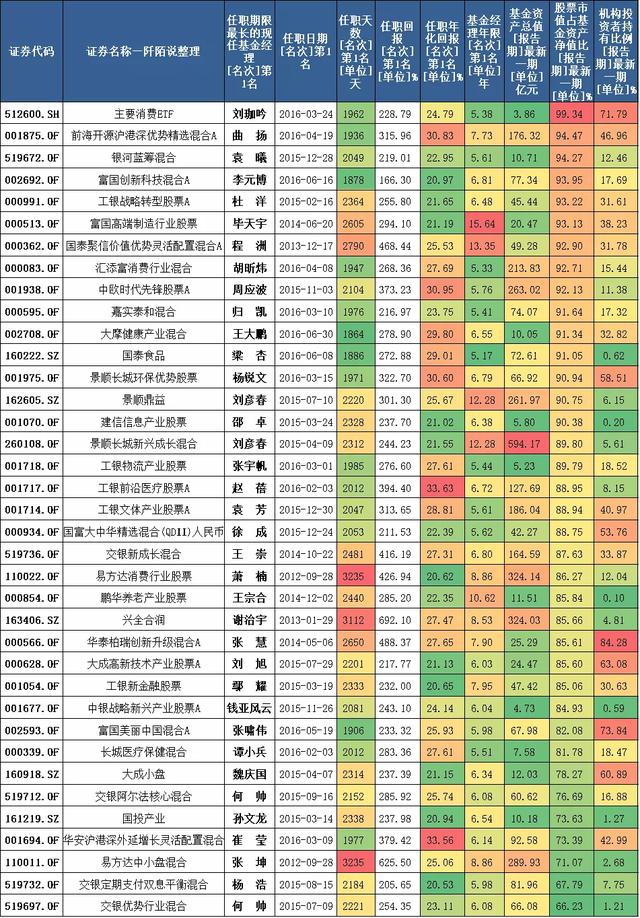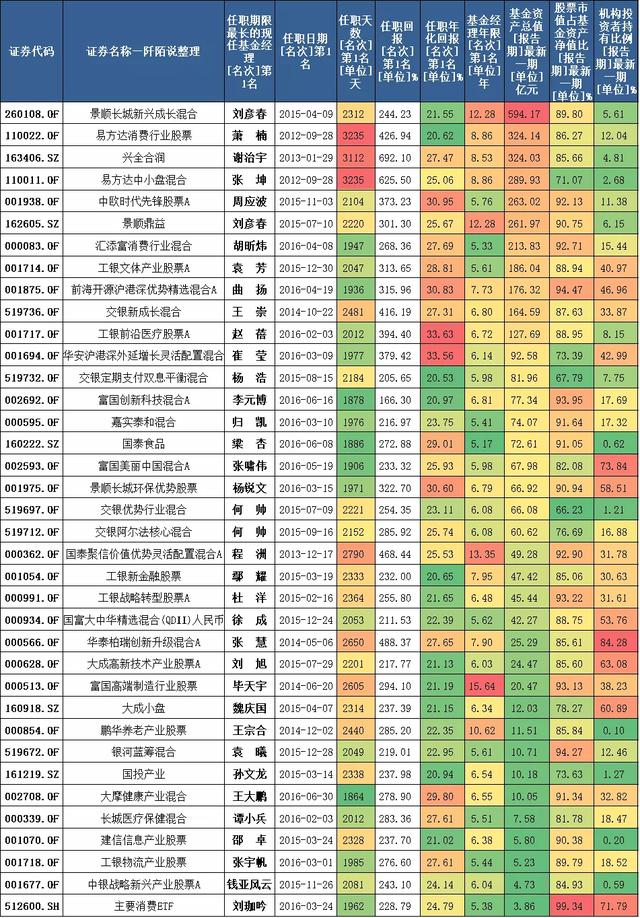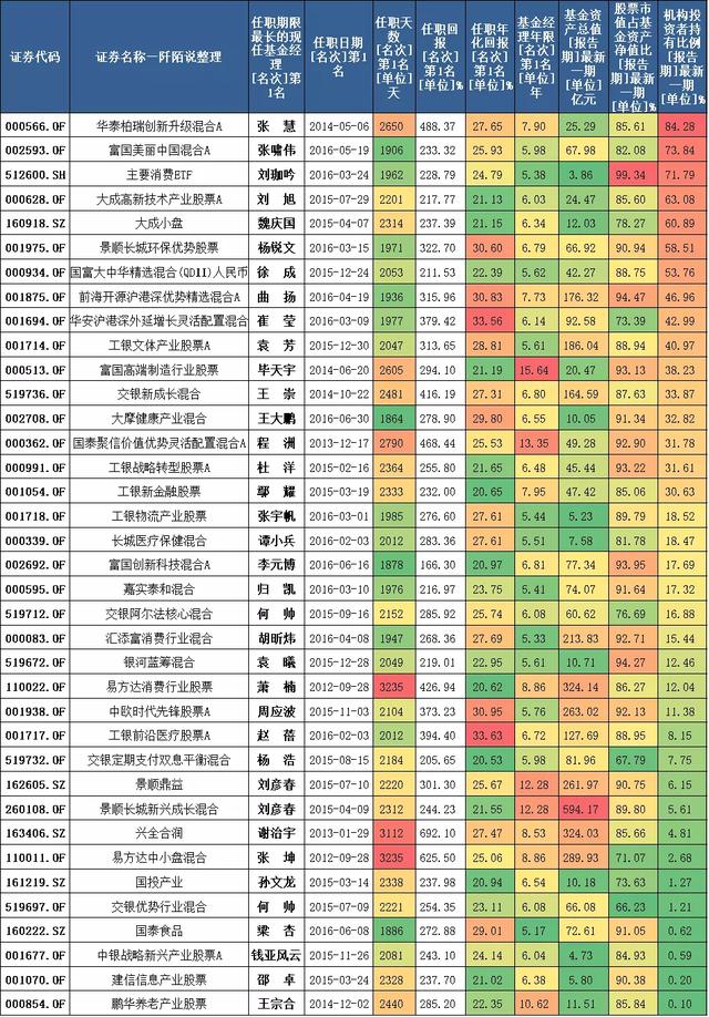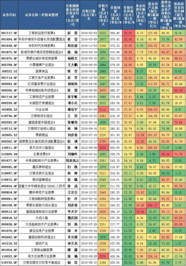 按基金经理年限由高到低排序如下。标红的四位基金经理都已经担任了10年以上的基金经理,毕天宇已经超过15年。