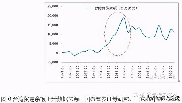 在随后短短的7个月时间里,台湾股市暴跌10000余点。此外,见顶于1987年下半年的贸易余额、外汇储备增量和1989年上半年的台币汇率等指标,反映出台湾外向型经济源动力、货币流动性的下降,这也是构成股灾形成和台湾经济被迫转型的重要原因。