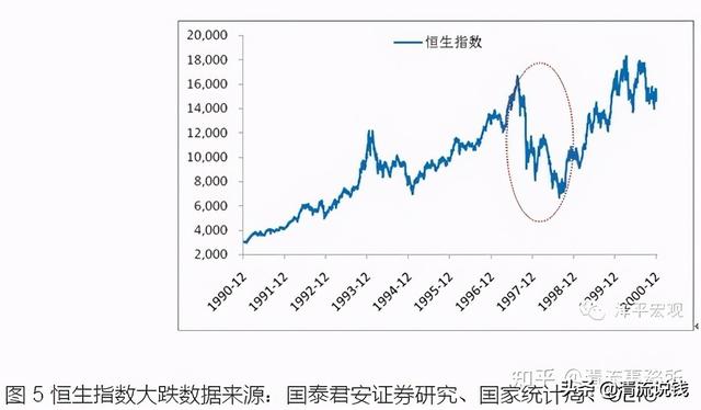 受益于国内改革开放步伐的加快,香港在90年代转口贸易和金融业不断增强,成为逐渐崛起的金融中心。1994-1996年香港GDP年均增长率达到4.5%,同时国内大型国有企业如上海石化、青岛啤酒(00168)等公司纷纷在香港上市,美国摩根士丹利等投资银行和国际基金不断加大港股在投资组合中比例,香港恒生指数在1994年2月4日达到12157点,之后经历了一段时期的下调,随着香港回归的临近,政治经济等不明确因素逐渐消除,市场再度活跃,1997年8月7日创造16673点的历史新高,较90年的2918点,涨幅达到659%。