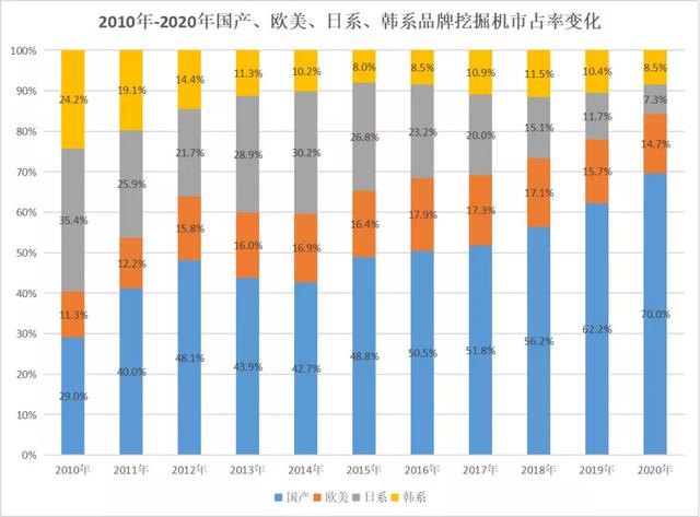 遥想2000年,彼时的中国挖掘机市场,外资品牌占中国挖掘机95%以上的市场份额,而在2010年,国产品牌的市占率也仅有约30%。但随着国产挖掘机品牌力和产品质量的持续提升,最近十年以三一重工、徐工为代表的自主品牌快速崛起,极大挤压了日系、韩系挖掘机的生存空间。2020年,国产品牌挖掘机市场占有率占比达到了约70%,而外资品牌仅有30%。十年间,国产与外资市占率便对调。