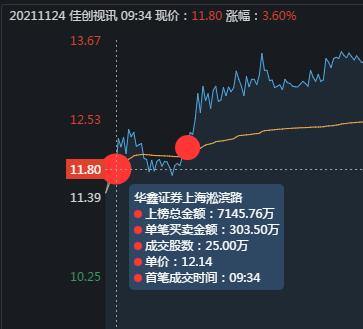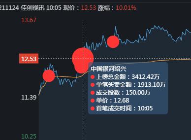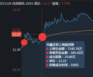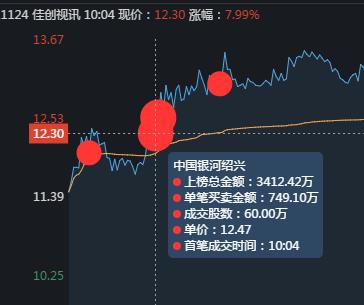 龙虎榜数据显示,买一顶级游资炒股养家首先出手,9:34分,在12.14价位买入2500手,把股价硬拉到6%附近。
