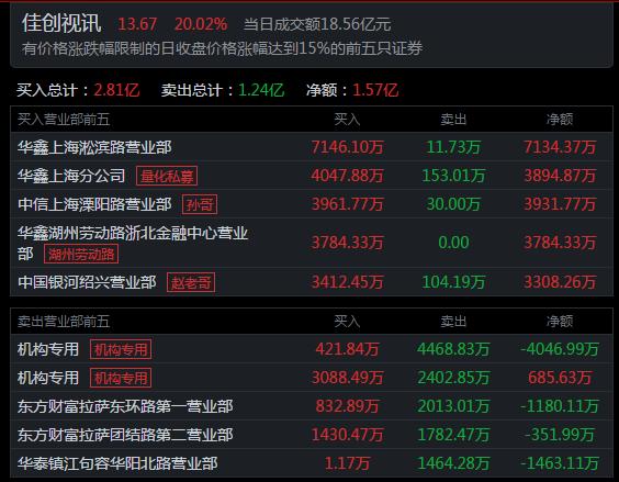 佳创视讯,全天成交18.6亿,换手率高达43.34%,龙虎榜前五买家共买入2.23亿,占比12%。