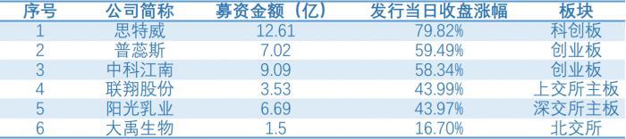 上周无破发股,共发行6家企业:C思特威-W(688213.SH)、联翔股份(603272.SH)、阳光乳业(001318.SZ)、C中科江(301153.SZ)、大禹生物(871970.BJ)、C普蕊斯(301257.SZ)。