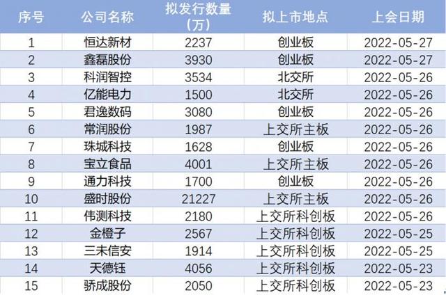 此外,本周(5月23日至5月27日)共计15家企业拟上会,科创板5家,创业板5家,沪市主板3家,北交所2家。