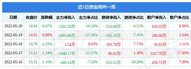 资金流向数据方面,5月20日主力资金净流出1202.2万元,游资资金净流出333.68万元,散户资金净流入659.33万元。
