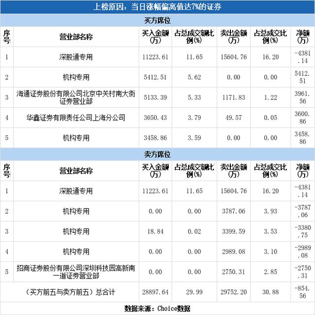 今日龙虎榜单上出现了深股通的身影,占据了买一、卖一的位置,净卖出4381.14万元,占当日成交总额的4.55%。除此之外深股通还参与到了长安汽车、四维图新、中粮科技等7只个股中,其中5家呈现深股通净买入,获净买入最多的是四维图新,净买额为8935.73万元;2家呈现深股通净卖出,遭净卖出最高的为长安汽车,净卖额为1.30亿元。