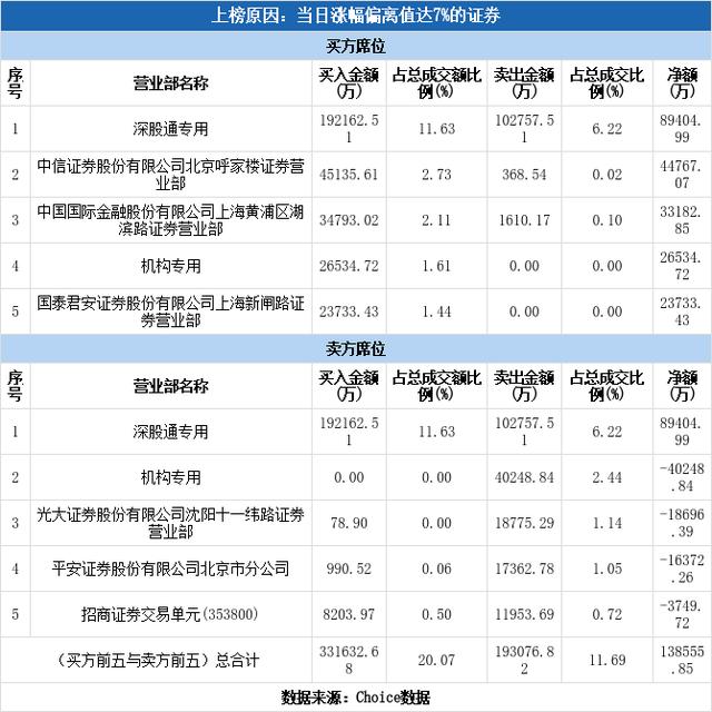 今日龙虎榜单上出现了深股通的身影,占据了买一、卖一的位置,净买入8.94亿元,占当日成交总额的5.41%,是获深股通净买额最高的个股。除此之外深股通还参与到了云海金属、顺鑫农业、上峰水泥等15只个股中,其中12家呈现深股通净买入,获净买入最多的是云海金属,净买额为3.52亿元;3家呈现深股通净卖出,遭净卖出最高的为上峰水泥,净卖额为7862.92万元。