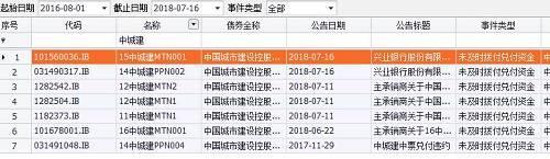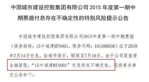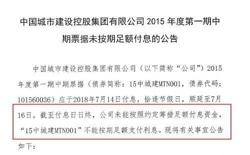 7月16日,中国城市建设控股集团有限公司(中城建)在上清所公告称,公司2015 年度第一期中期票据 (债券简称:15中城建MTN001,债券代码:101560036)应于2018年7月14日付息,恰逢节假日,顺延至7月16日。截至付息日日终,公司未能按照约定筹措足额付息资金,“15中 城建MTN001” 不能按期足额支付利息。