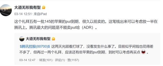 3月14午间,段永平接连更新两条动态,称“这个礼拜五有一批145的苹果的put到期,很久以前卖的。这笔钱出来可以考虑放一半在腾讯上。”