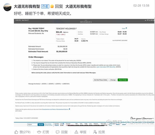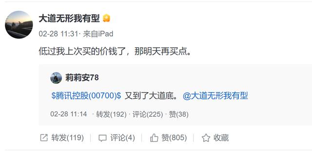 而在2月28日时他已经发声:“腾讯低过我上次买的价钱了,那明天再买点。”