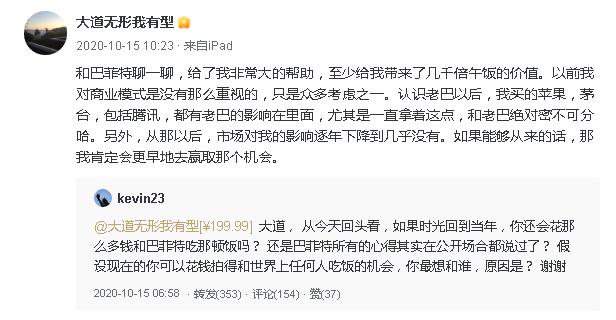 如今,回顾和巴菲特的午餐,段永平表示:和巴菲特聊一聊,给了我非常大的帮助,至少给我带来了几千倍午饭的价值。以前我对商业模式是没有那么重视的,只是众多考虑之一。认识老巴以后,我买的苹果,茅台,包括腾讯,都有老巴的影响在里面,尤其是一直拿着这点,和老巴绝对密不可分哈。另外,从那以后,市场对我的影响逐年下降到几乎没有。如果能够从来的话,那我肯定会更早地去赢取那个机会。