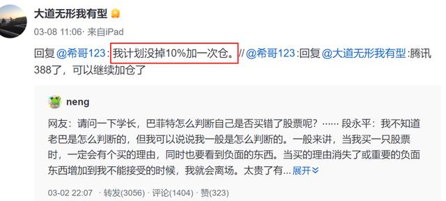 3月8日时,他曾表示,计划腾讯每跌10%,就加一次仓。