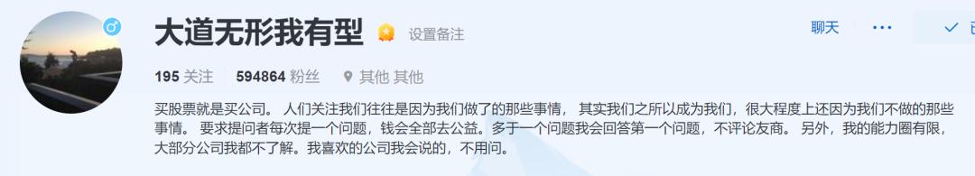 资料显示,段永平的雪球账号有近60万粉丝。简介中他表示:\”买股票就是买公司。我喜欢的公司我会说的,不用问。\”