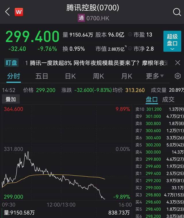 今天,港股又崩了,腾讯更是首当其冲,一度跌破300港元关口。