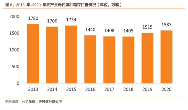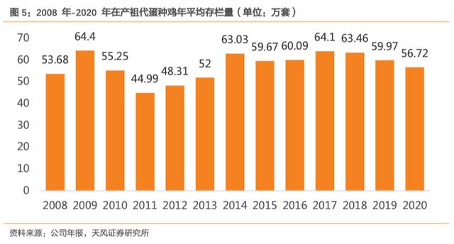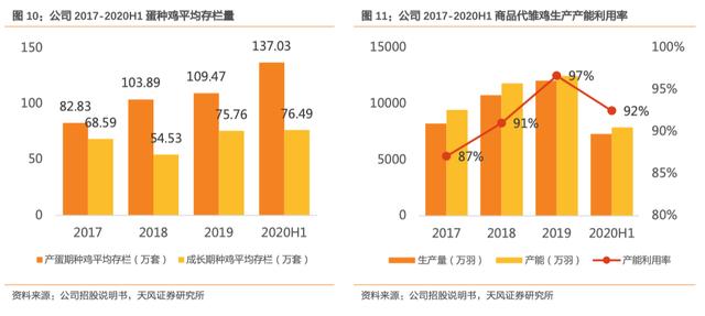 公司在 2017 年禽流感疫情影响后养殖规模逐步扩大,其中产蛋期种鸡平均存栏量关键性指标连续多年攀升。同时,公司商品代雏鸡生产产能利用率也不断升高。排除 2020 年因新冠疫情导致停工停产因素,其产能利用率始终维持在较高水平。截至到 2020 年 H1,公司祖代蛋种鸡存栏约 5.56 万套,父母代蛋种鸡存栏约 188 万套,年可向市场推广商品代育成鸡约 96 万羽、商品代雏鸡约 15,000 万羽。