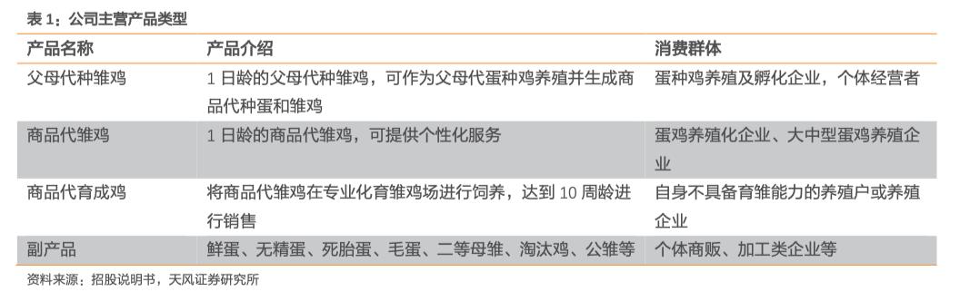 公司蛋鸡的业务主要包括祖代蛋种鸡、父母代蛋种鸡养殖;父母代种雏鸡、商品代雏鸡(蛋) 及其副产品销售;商品代育成鸡养殖及销售。在养殖方面,公司引入“全网面高床平养” 的福利化养殖模式;在销售方面,公司独创使用“集中养殖,分散孵化”的模式,从而确保公司产品更接近客户、为客户提供更高品质的产品。公司对外销售的主要产品为父母代种雏鸡和商品代雏鸡、商品代育成鸡及其副产品。