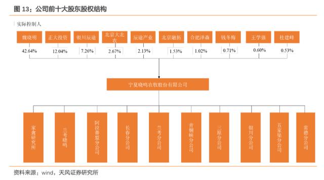 截止到 2021 年 4 月 13 日,晓鸣股份实际控制人魏晓明先生为公司创始人,所持股份占公司总股本 42.64%,是公司控股股东。除魏晓明先生外,公司前五大股东为正大投资、银川辰途、北京大北农与辰途产业基金,持股比例分别为 12.04%、7.26%、2.67%与 2.13%。魏晓 明先生自 2011 年起担任晓鸣农牧董事长兼总经理,掌舵公司十年,公司管理层保持稳定。