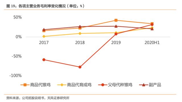 1)新冠疫情使得企业、学校等单位阶段性停产停工导致鸡蛋的消费出现下滑;2)2019 年的行业上升周期推高了在产蛋鸡的存栏量,从而导致对于商品代雏鸡需求减少,叠加上饲料成本上涨,导致养殖的单位成本抬高,进而拉低商品代雏鸡的毛利率。我们预计随疫情的逐步稳定和改善,公司商品代雏鸡的毛利率有望回升。