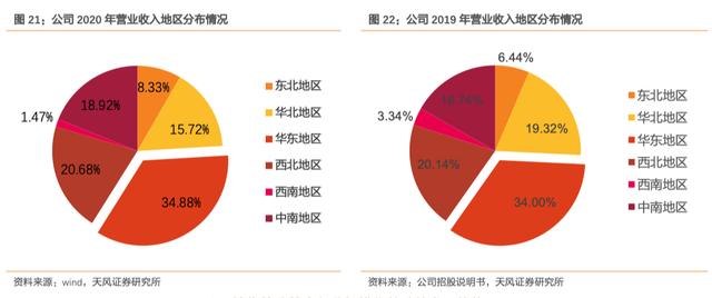 将公司的主营业务按地区划分来看,其华东地区销售收入占比超公司总营收的三分之一。截至 2020 年,华东地区主营业务收入占公司总体 34.88%,西北地区次之,占比达 20.68%。与 2019 年相比,其比重变化较小,地区销售占比保持稳定。此外,由于公司在西南与东北地区开展业务较晚,因此上述两个地区营业收入占总收入比例较小。