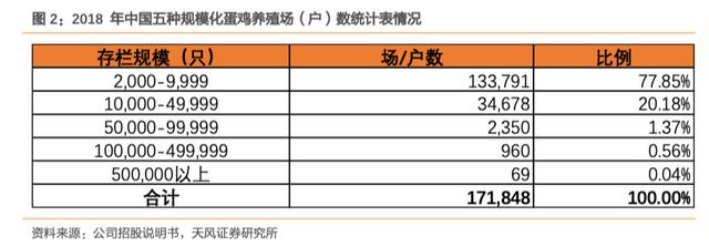 我国蛋鸡行业目前整体呈现“小规模、大群体”的产业格局。从养殖规模角度看,我国商品代蛋鸡养殖主体仍然以中小规模养殖场(户)为主。根据最新的《中国畜牧兽医年鉴 (2018)》数据显示,全国范围内全国范围内存栏规模 2,000 只以上的蛋鸡养殖场(户)共 171,848 个,其中 10 万只以下的中小规模蛋鸡养殖场(户)数量为 170,819 个,占比达到99.40%,而 10 万只以上的大规模养殖场(户)数量仅为 1,029 个,占比仅为 0.6%。