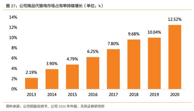 公司“拳头”产品(商品代雏鸡)市占率自成立以来得到稳步提升,截止到 2020 年公司市占率由 2013 年的 2.19%提升到 12.52%,年复合增长率约 28%。目前公司已经发展成为蛋鸡制种行业规模最大、最具影响力的企业之一。我们预计随着公司此次募资项目后续逐步落地,公司在商品代雏鸡上的产能和品质将得到进一步提升,业务区域覆盖能力也将得到进一步拓展,有望持续提高市场占有率及行业影响能力。