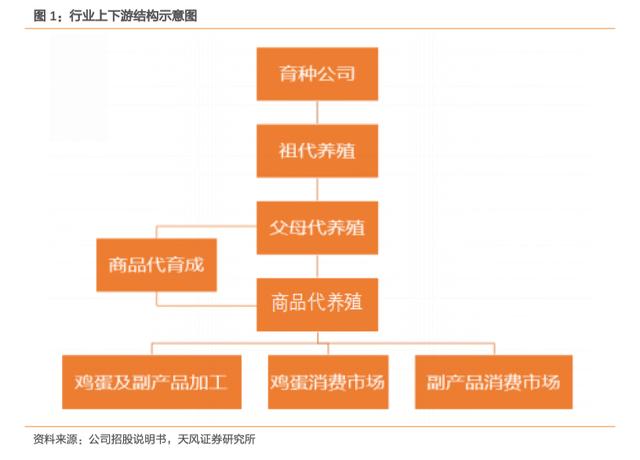 蛋鸡产业最上游为育种公司,最下游为鸡蛋、副产品消费市场及相关加工产业。由于蛋鸡金字塔式育种和制种的特点,其养殖数量规模从祖代养殖至父母代养殖再至商品代养殖逐步扩大,呈现出祖代养殖规模较小、商品代养殖规模较大的特点。