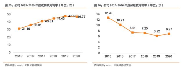 公司在 2017-2020 年期间应收账款周转率稳定提升,其周转率分别为 40.81 次、44.43 次、 47.55 次以及 46.77 次。同期,公司应付账款周转率为 7.41 次、7.25 次、6.22 次以及 6.97 次。应收账款周转率的提升表明公司能更快回笼资金,使得公司现金流更为健康,进而使得营运能力提升;应付账款周转率的下降也使得公司有更充足的时间支付账款。因此,通过从稳步增长的应收转款周转率以及较低的应付账款周转率分析,我们推断公司在销售产品给下游的经销商时或有较强的话语权。