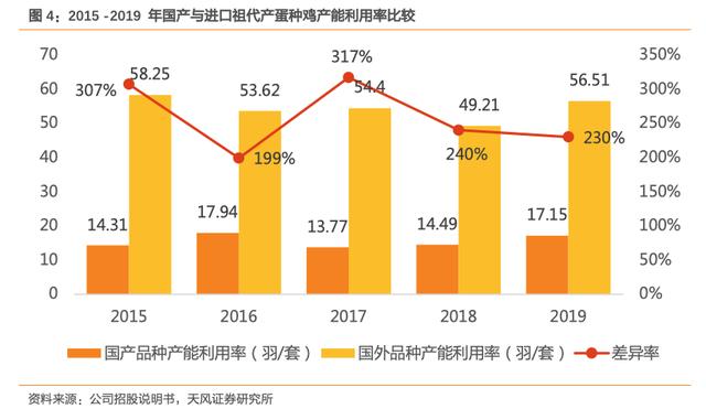 根据中国禽业发展报告数据显示,国外引进品种祖代在 2015-2019 年产蛋种鸡全年产能利用率始终高于国产品种的 100%以上。
