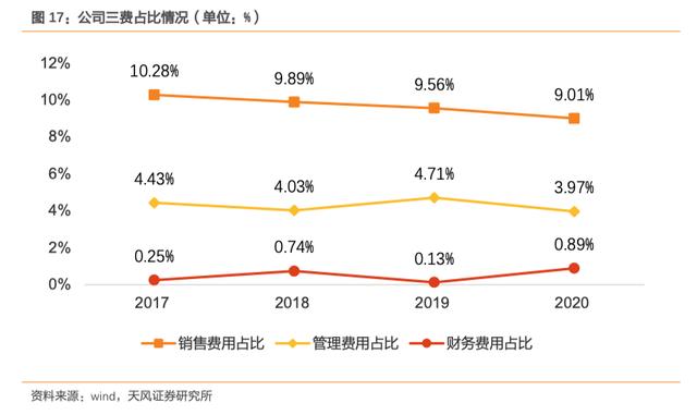 三费方面,公司销售费用占比和管理费用占比有所改善,但财务费用占比略有增加。截止到 2020 年,管理费用占比、销售费用占比以及财务费用占比分别为 3.97%、9.01%和 0.89%。