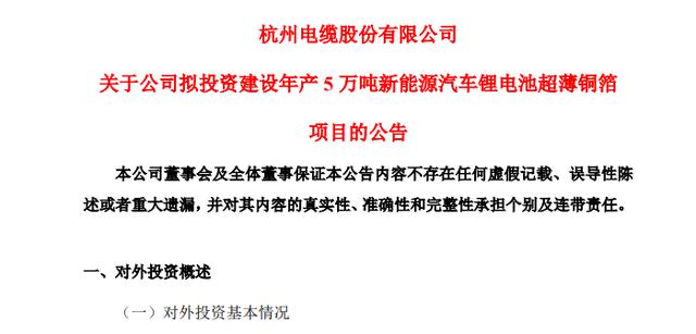 “本次对外投资符合公司战略发展规划,是公司立足长远利益所作出的慎重决策,公司布局新能源汽车锂电池超薄铜箔项目,进一步拓展了公司产业布局,推动了公司在新能源产业的发展,增强了公司发展潜力。”杭电股份表示,本次对外投资将增加公司资本开支和现金支出,从长远来看对公司业务布局和经营业绩具有积极影响。
