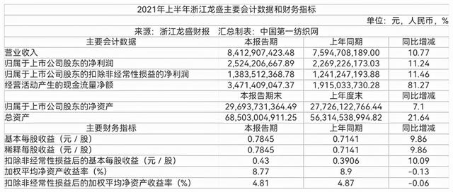 2021年上半年,浙江龙盛实现营业总收入84.13亿元,同比增长10.77%,实现归属于母公司股东的净利润25.24亿元,同比增长11.24%。