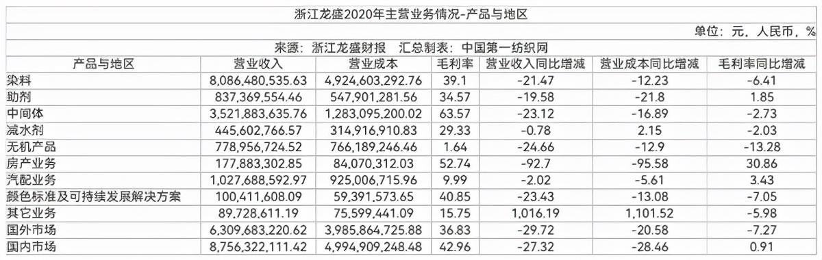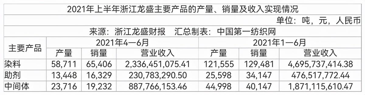 第一纺织网据财报了解到,浙江龙盛是全球产能最大的染料供应商,公司成立于1970年,2003年在上海证券交易所上市,是国内染料行业第一家上市公司。公司业务以染料、助剂、中间体等特殊化学品为主,同时发展房地产、钢铁汽配、金融投资等多元化业务。公司现已成为全球最大的纺织用化学品生产服务商,拥有30万吨染料、10万吨助剂和11万吨的中间体产能,染料和助剂产能均居全球首位。截至目前,浙江龙盛在12个国家拥有18家工厂,在50个国家设有代理机构,约占全球染料行业近21%的市场份额。
