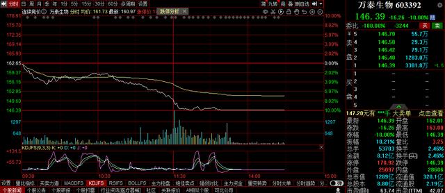 今日(5月26日),万泰生物(603392.SH)早盘股价快速跳水,午后放量封死跌停。成交额达8.11亿,报收146.39元/股,市值1289亿元。