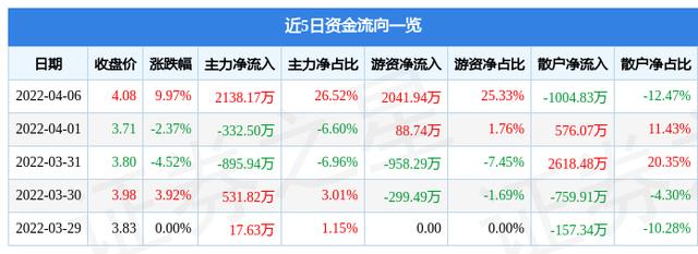 资金流向数据方面,当日主力资金净流入2138.17万元,游资资金净流入2041.94万元,散户资金净流出1004.83万元。近5日资金流向一览见下表: