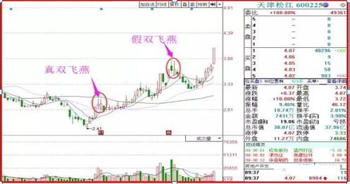以近期火热的天津松江股作为实战案例解析,大家可以看到,10月25日和26日股价突然强势的站上短期均线,主力正好借助上方的60天均线打出双飞燕形态洗盘,后市股价节节攀升。(真双飞燕的收盘价都在大阳线之上)