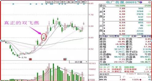 当“双飞燕”形状出现后,股价一般都有15%以上的涨幅,从这个意义上说,双飞燕还有着推测顶部之功能。所以本人说这个形态一般出现都是大肉。