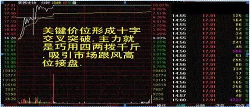 “十 字交叉”是股价突破的信号是第一起涨点形成的价格关键因素。在图形中常见到用一个十字线交叉的分时线,这个十字线的上下线和底下的顶天量峰重合,实际上这一点就是股价突破新高的位置,在盘口分析中这种价格突破点必须放量,主力就是利用这种技术形态的突破,做出一种强势上攻的意图,来吸引更多的跟风者,这也许是在许多技术分析中特别强调的一点,主力做图不是随意的,大家共同遵守的规则是主力达到目的的最好工具。
