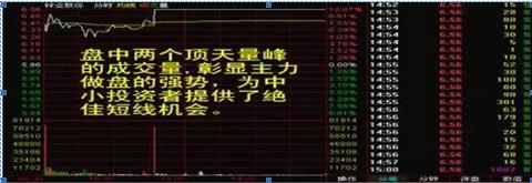 “顶 天量峰”是一种非常典型的强势股票的上涨特征,是主力拉抬的明确信号,是股价起飞的信号灯。经常看盘的投资者肯定会有这样的认识,那些涨停的股票或者是短 期内快速上涨的股票,在它们发起总攻那一瞬间会出现异常的成交量,平时只有几十手的成交量水平,一旦股票开始快速上涨,成交量马上就变大几倍甚至几十倍, 突然出来的大笔成交让我们都不约而同的认识到主力开始拉抬了,在分时图中留下了一根根长的成交量线,我们形象的叫它为“顶天量峰”,这是一种股价即将快速 上涨的标志,是一种信号,通常这个量峰越大股价上涨的力度和可能性越大。