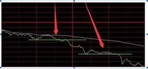 如上图,这种形态也是比较经典的当日应该建仓或者出局的形态,收到均价线压制,震荡后拐头向下,是重要减仓点,卖点在每次反弹到均价线附近和跌破平台位置。