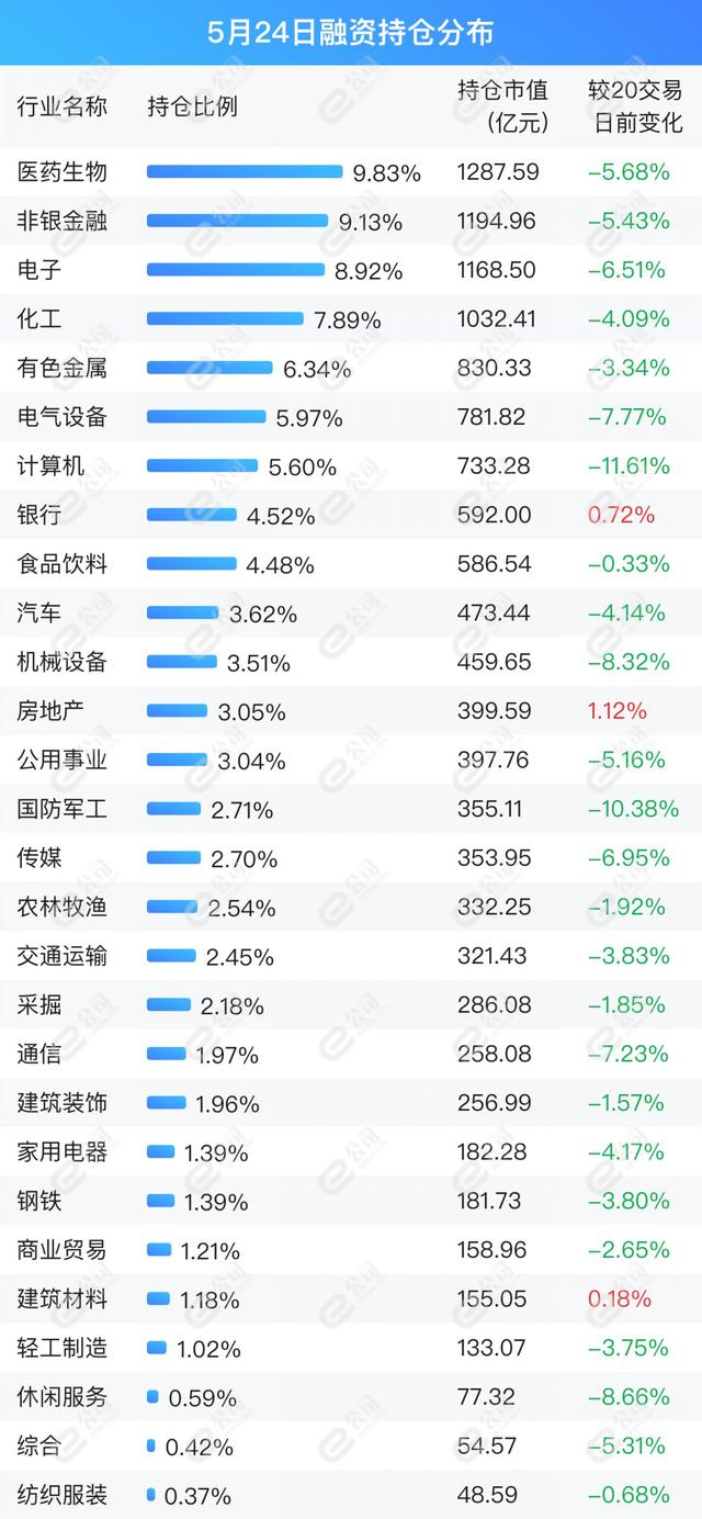 e公司数据统计显示,截至5月24日,融资持仓市值前五行业为医药生物、非银金融、电子、化工、有色金属,占持仓总市值42.11%。